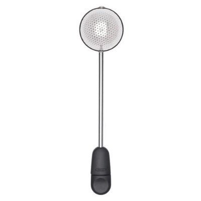The OXO Brew Twisting Tea Ball makes it simple to scoop, steep and savor your favorite loose leaf tea. The unique twisting handle lets you load a generous amount of tea into the Ball while the spinning design makes for easy emptying. Extra small etched holes prevent unwanted particles from escaping into your cup, and the right-sized neck fits most mugs and rests safely against the sides without slipping. With a soft grip for comfortable stirring, the Twisting Tea Ball is also great for steeping herbs and spices. Dishwasher safe.